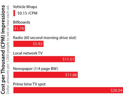 Whether you have a single vehicle wrap or a fleet of a hundred to brand, pardon the pun, but your vehicles are your more efficient branding vehicle you have. The Outdoor Advertising Association of America calculates mobile advertising to be the most effective and efficient form of out of home advertising. A vehicle wrap delivers a thousand impressions for around 4 cents, while other forms of advertising cost significantly more. For instance, outdoor signs costs around $3.56 per thousand impressions and newspaper ads cost $19.70. Not only does fleet vehicle advertising deliver a ton of impressions, but it also works, boosting name recognition 15 times greater than other forms of advertising. So don’t miss your easiest, most powerful and greatest efficient branding opportunity with a blank vehicle.